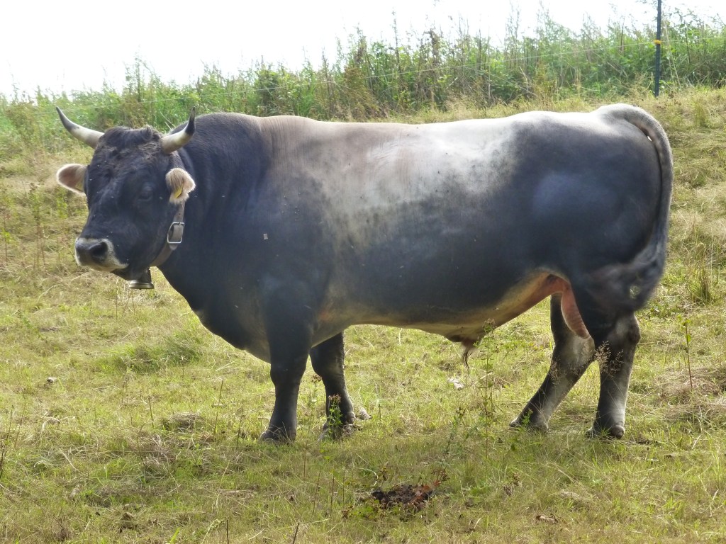 Unser Zuchtstier Darian lebt seit 2010 bei uns auf dem Hof Sonnenweide. In den 12 Jahren hat er uns sehr viel Freude gemacht, da er immer sehr zuverlässig und ehrlich im Umgang war. Er ist halfterführig, lässt sich einfach verladen und kann auch am Halter umgeweidet werden. Darian steht eher im Milchtyp und hat zahlreiche schöne Kälber hervorgebracht. Bei den Stieren vererbt er seine dunkle Farbe, Kuhkälber bleiben grau. Der Stier hat eine schöne Rückenlinie und ein ordentliches Fundament. Darian ist im Herdbuch B eingetragen, weil leider die Genetik des bereits verstorbenen Vaters nicht mehr nachgewiesen werden konnte. Über die Dokumentation der Herdbuchpapiere aus der Schweiz ist die Abstammung jedoch zweifelsfrei belegt. Darian hat sich in unserer Herde als charakterstarker Stier erwiesen, der seine Herde sicher und ruhig führt. Um seinen gutmütigen Charakter zu bewahren, verlässt Darian unseren Hof für Deckeinsätze nicht mehr. Kühe müssen gebracht werden, wenn sie gedeckt werden sollen.